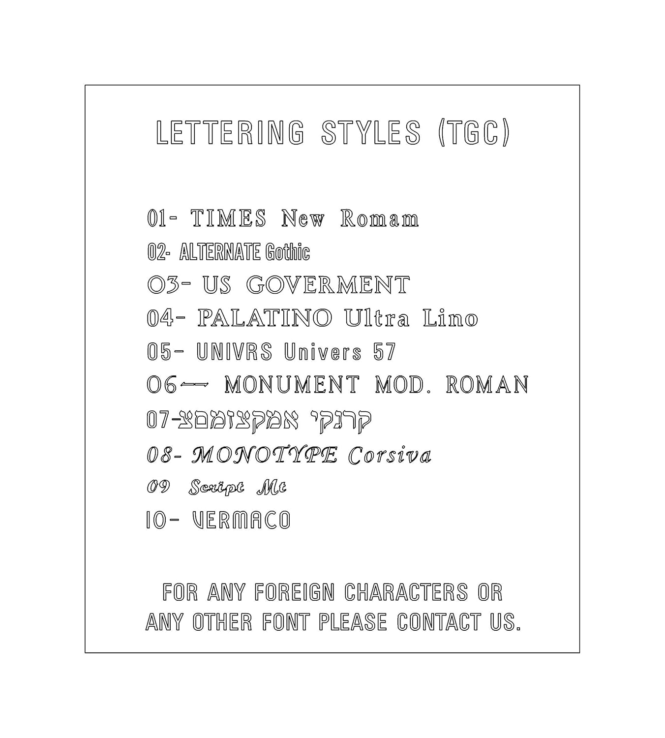 We will be happy to assist you determining what will work best. Lettering Styles Except when using script forms the lettering of memorials is usually done in capitals. FROSTED OUTLINE LETTERING consists of a non-polished letter set against a polished background with an incised line around each letter.