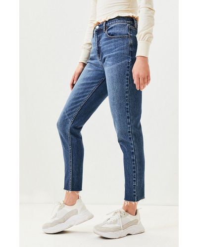 Up to 5 cash back Head out into the city and strut your stuff in the flattering Jukebox Blue Vintage Icon Mom Jeans. Made from a stretch fabric that lends a comfortable fit these high-rise jeans are complete with a raw cut hem 4-button front closure and a straight leg. Shipped with USPS Priority Mail.